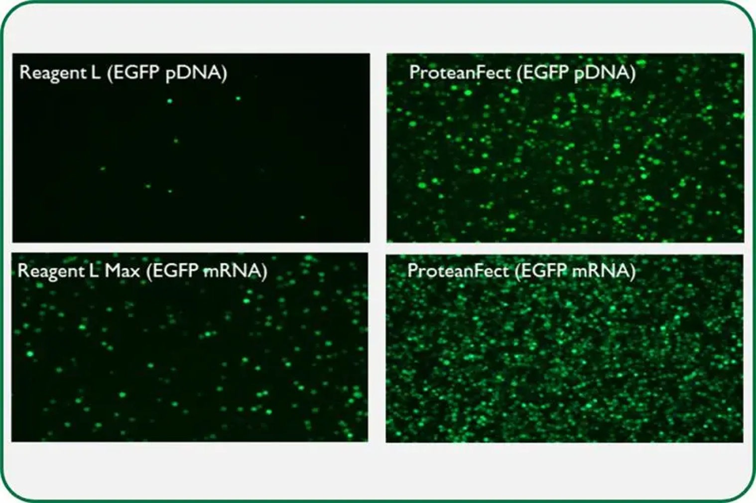 トランスフェクション試薬(Reagent L)もしくは ProteanFect を用いて、EGFP 発現プラスミド(pDNA)および EGFP mRNA をJurakat T 細胞に導入した際の、発現効率の違いを示しています。ProteanFect は Reagent L と比べて、pDNA・mRNA のいずれにおいても導入効率が高いことが示されています。