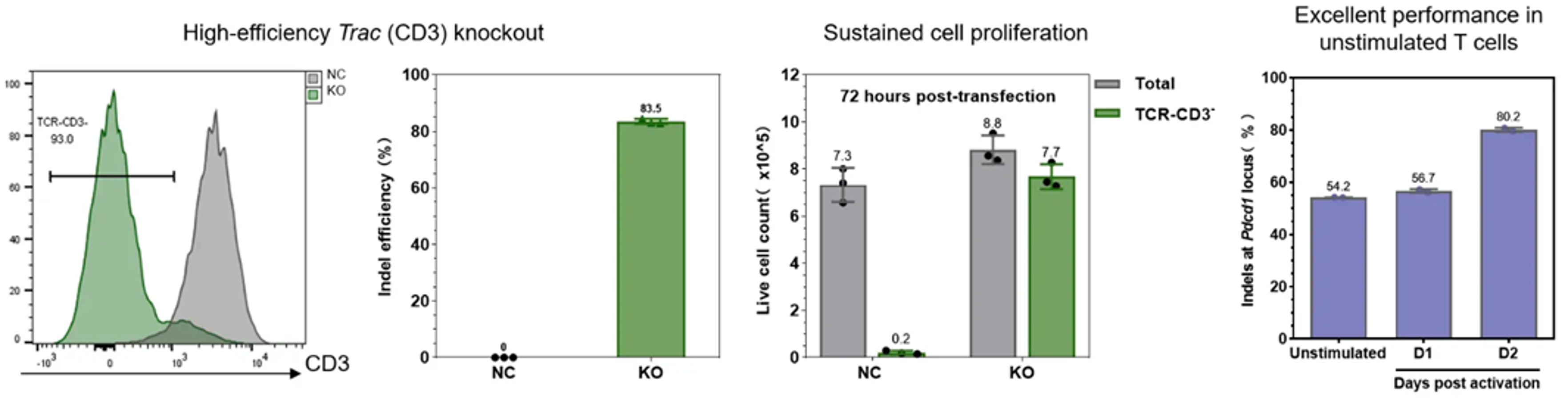 中央図)細胞増殖データでは、ノックアウト後 72 時間でも TCR-CD3⁻ 細胞が高い生存率を維持しており、ProteanFect による細胞健全性を損なわないことが分かります。