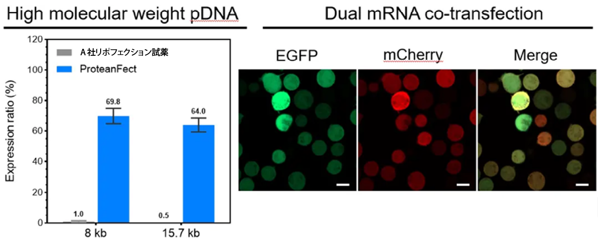 右図)2 種類の mRNA(EGFP と mCherry)を ProteanFect で同時導入をしています。共トランスフェクションにも対応できることが確認できます。